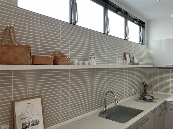 キッチンの上に固定してある長い棚になります。受け材が壁の中に隠されているタイプなのでスッキリしていいですよね!