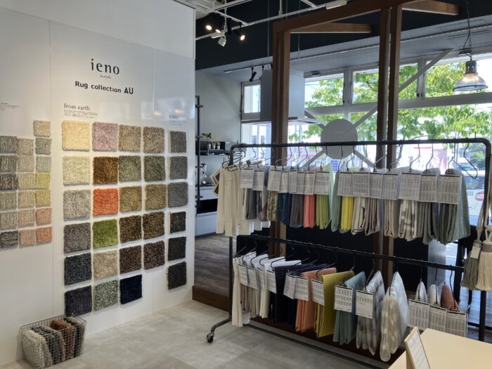 ienoさんは布の専門店で、オノヤではienoさんのカーテンやラグのサンプルを豊富にご用意しております。