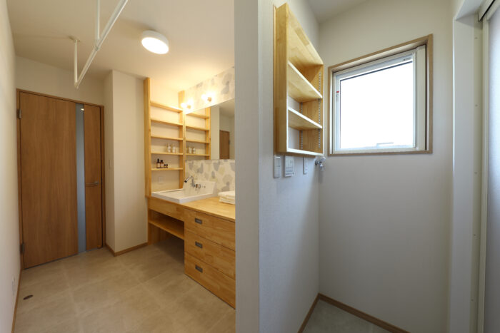 洗面化粧台は造作で納め、カウンター上には細かな収納ができるよう奥行きの浅い棚を設置し、化粧台下には引き出し収納を作成し、収納量も確保しています。見せる収納と隠したいものを分けてしまうことができます。