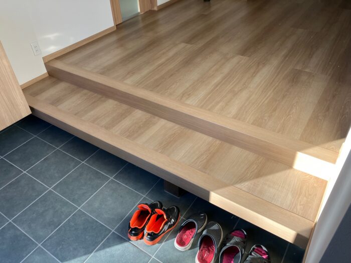 廊下と同じフローリングで合わせて上張りすることで、統一感を持たせられたと思います。