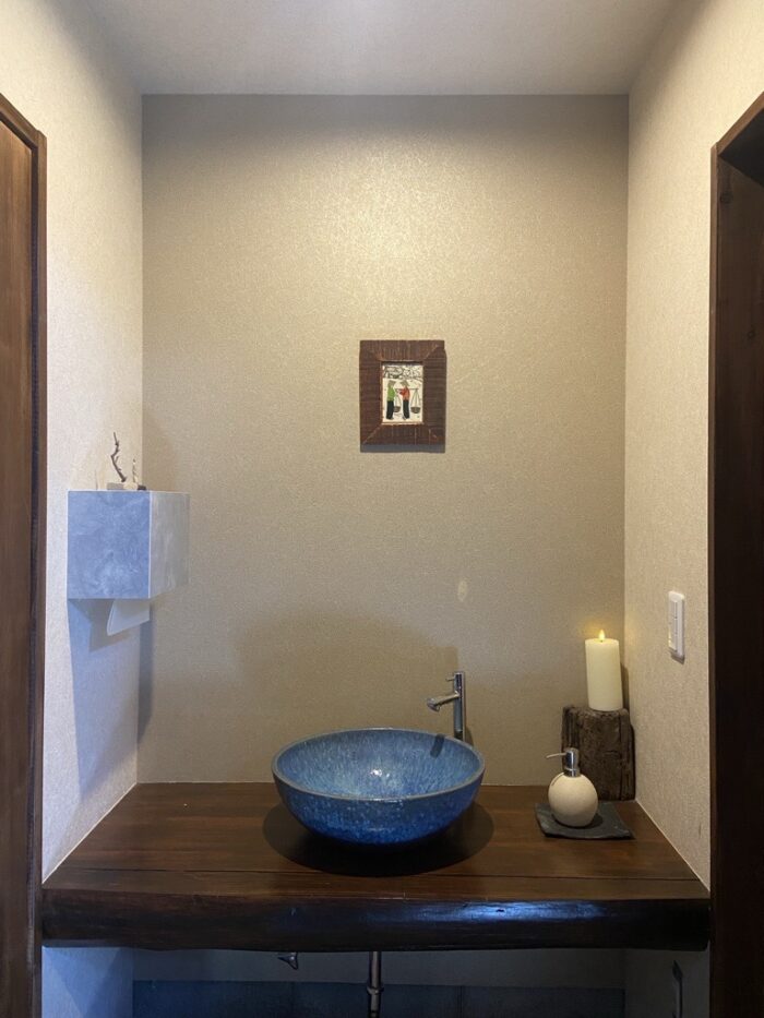 特にお気に入りの造作洗面台は、恐らく洗面カウンターは古材を活用して塗装しているのではないかと予測しております。集成材などの加工材を使用するよりも、奥深さを感じます。