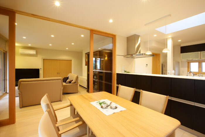 この写真のように、天井までいっぱいの建具を設置すると、部屋のつながりに開放感が出て、LDK空間のイメージに対して、建具の存在意義を崩さない納まりが出来ます。但し造作品などの場合、ここまでの高さの物を作ると、建具の強度に注意が必要で、作成の際には十分な施工配慮が必要です。ご要望の際は施工店側とご相談下さい。