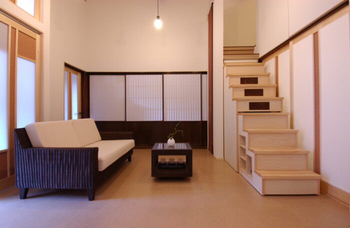 この階段面白い仕掛けがあり、小スペースの収納型になっていて、3尺の空間に稼働型の引出し階段が収納できるように工夫しています。この事でリビングの室内面積を、固定の階段スペースで無駄にせず、ロフトには必要な時だけ階段を引き出して上ることが出来ます。