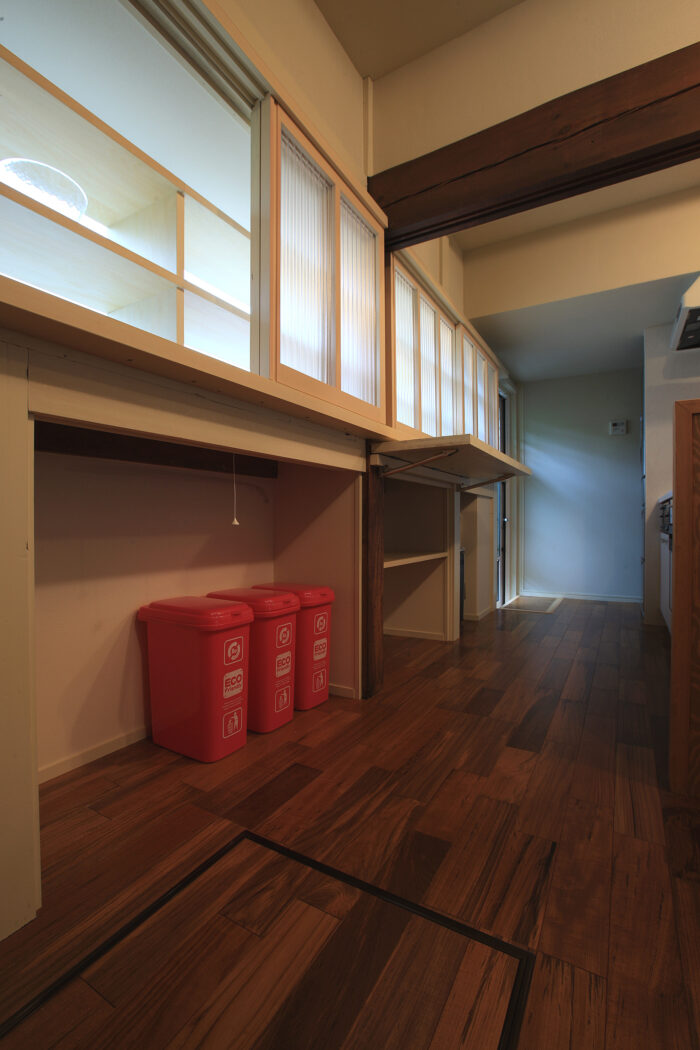 キッチンの背面にゴミ箱などを隠したい場合、デッドスペースであれば丸見え感を無くすために、窓装飾などに用いるロールスクリーンを使うと、見た目もスッキリして、コスト的にも建具を作るより安価で済むので、なかなか重宝すると思います。