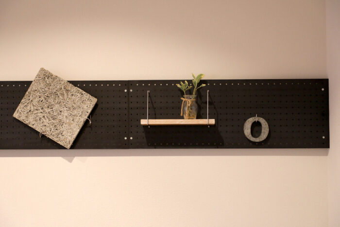 パンチングされた板状のものに、穴のピッチに合わせてフック状の金物をかけた状態で棚などの設置したり、アレンジ次第でいろんなバリエーションが楽しめます。壁の色が白身であればあえて対照的なブラックの色などにすると、壁のアクセントにもなり、室内の雰囲気が出ます。