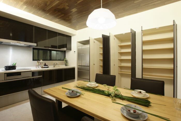こうする事で把手の凹凸感を無くし、より面材をフラットに見せるよう強調しています。中の物もチラ見させるのもなかなか雰囲気を出せます。