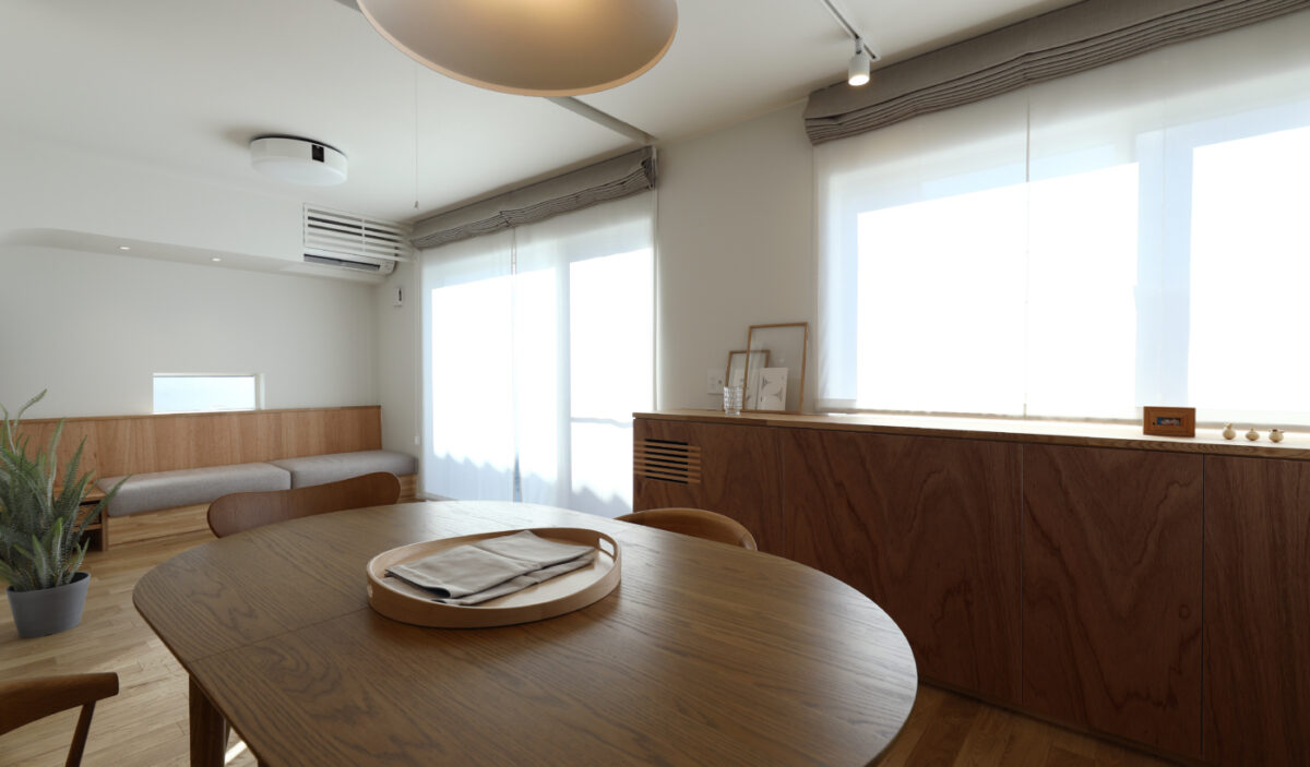 限られたスペースを有効に活用し、収納や家事スペースなどの実用性を備えつつも、広さを感じられ温かみのあるLDKをデザインしました。 枠などは極力排除して窓台とカウンターと同化させたり、天井も壁も白のクロス一色で仕上げたりすることで、すっきりとした印象に仕上げました。