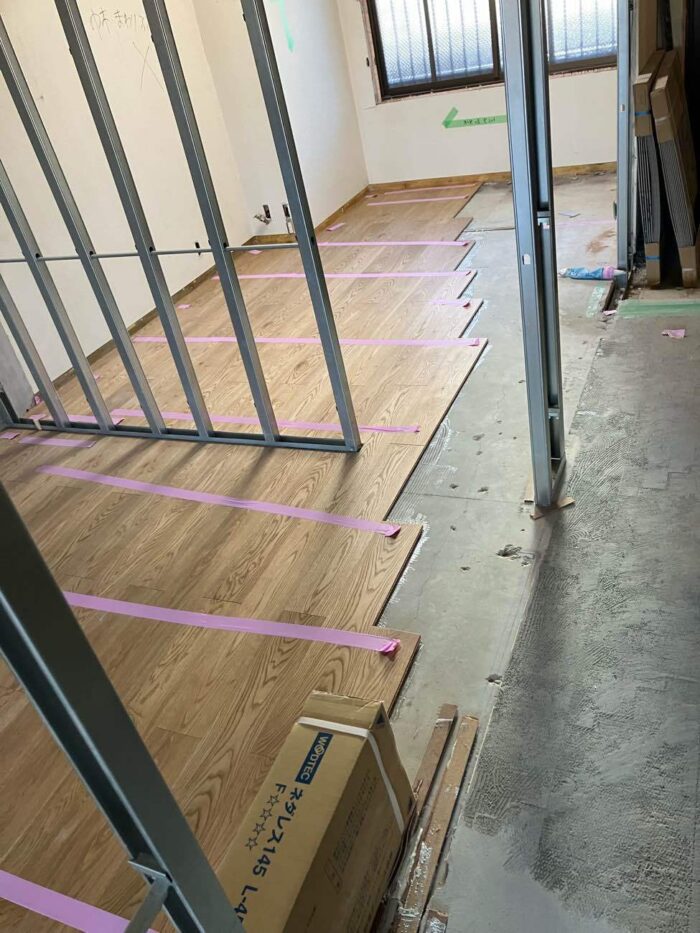 フローリング材の施工が始まりました。