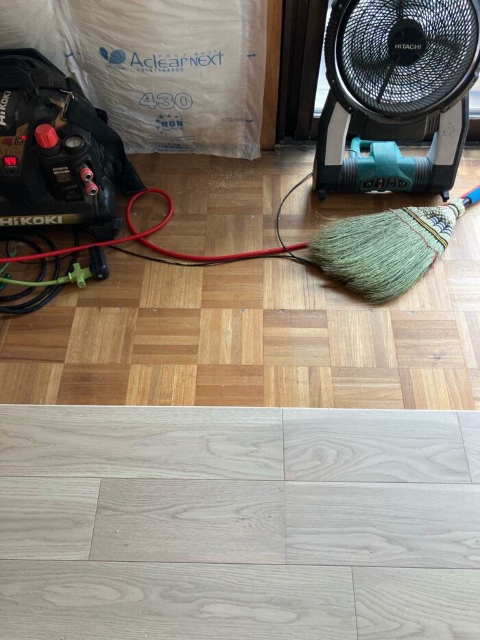 こちらは既存のフローリングに新しいフローリングを重ね貼りしている様子です。