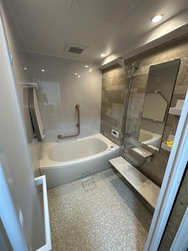 浴槽横にL型手すりを設置することで、浴槽への出入りがすごく楽になります!オススメです!!