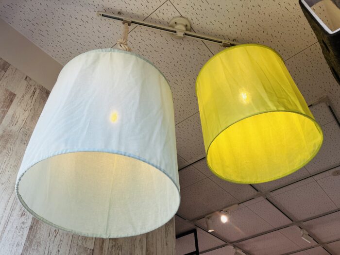 2階にあるこちらの照明は、ieno textileの「TOSS」という布をシェードとして採用した照明です。