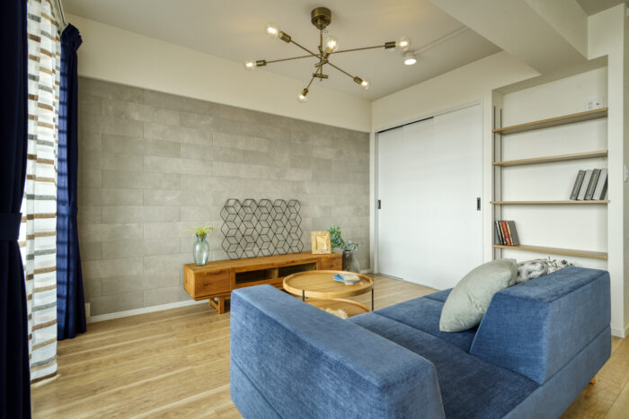 細長のグレーのタイルが視覚的にもお部屋の横幅を広く見せている効果もあります。