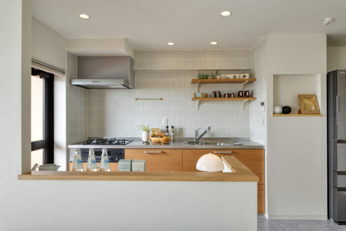 ミディアムウッドのキッチンとのバランスも良く、品良く馴染んでいます。