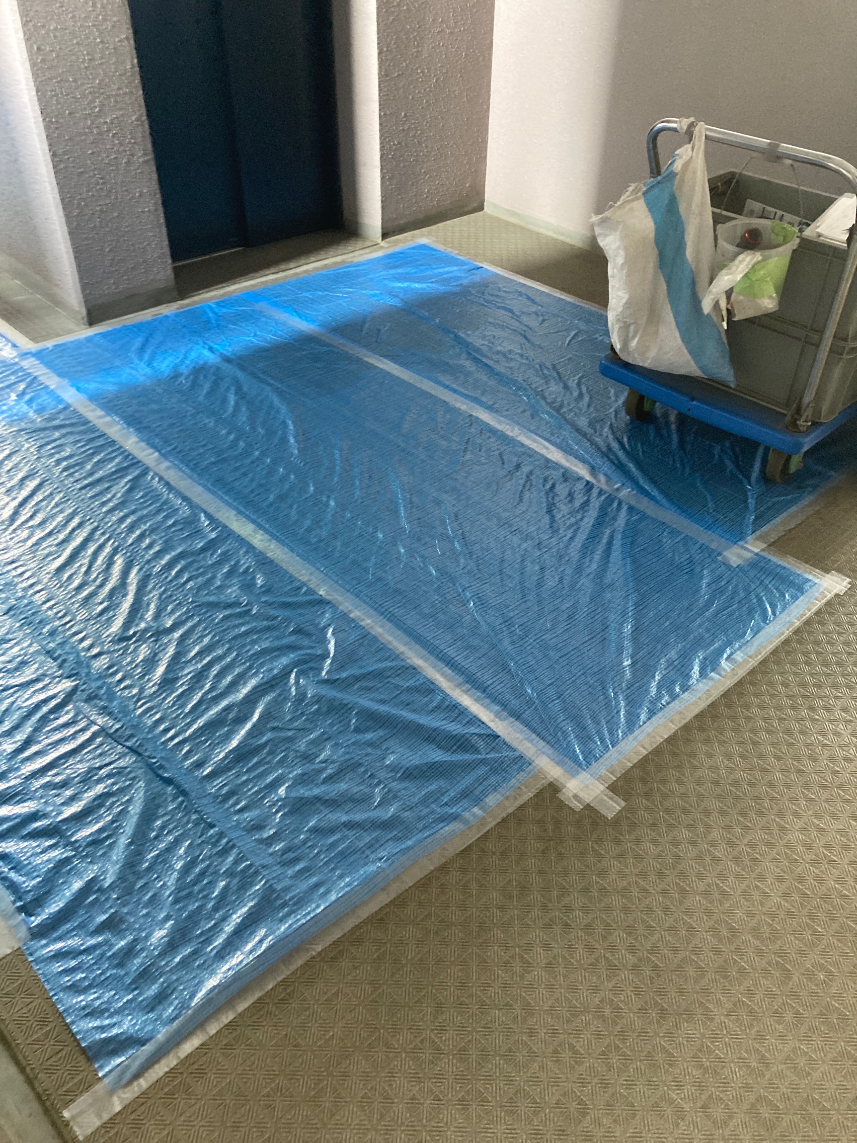 先日、マンション工事にて共有部通路の養生してきました。