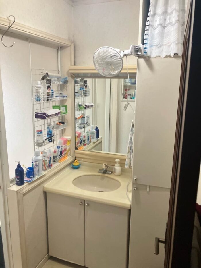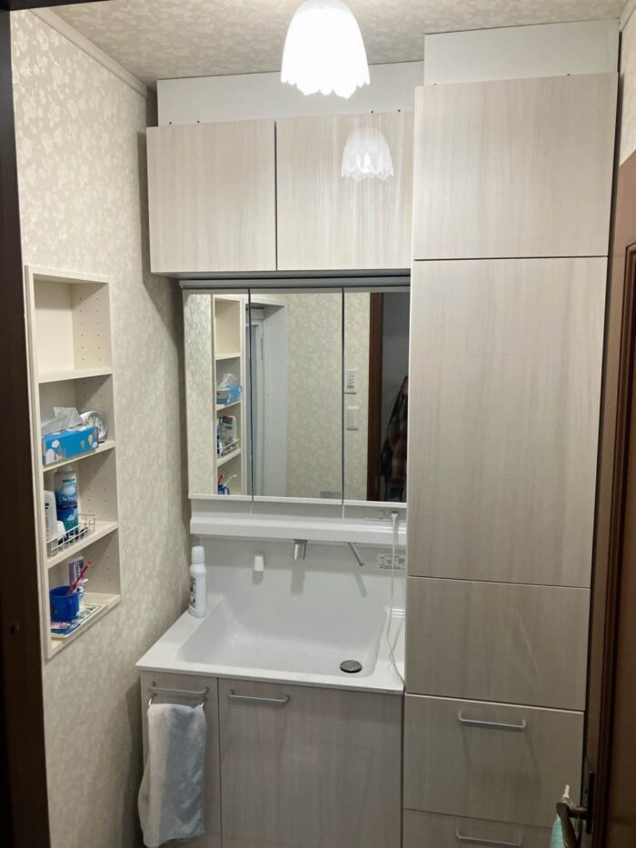 洗面台だけでなくキャビネットの追加設置と、左手側に埋め込み収納を取り付けましたので以前よりもスッキリとした空間になりました!