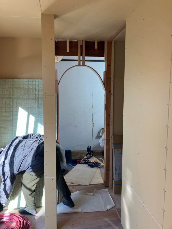 キッチン、和室、和室と3部屋が壁で区切られていたのですが、その壁を解体し、LDK+土間収納という間取りに変更する工事です。