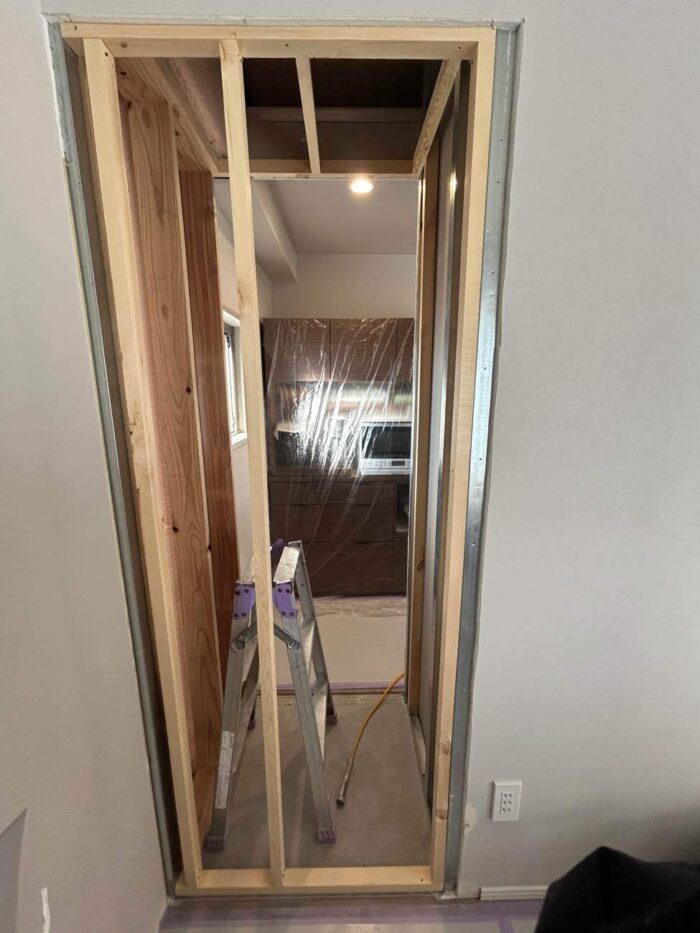 既存の収納棚を壁で塞ぎ、反対側にオープンの棚を取付けします。