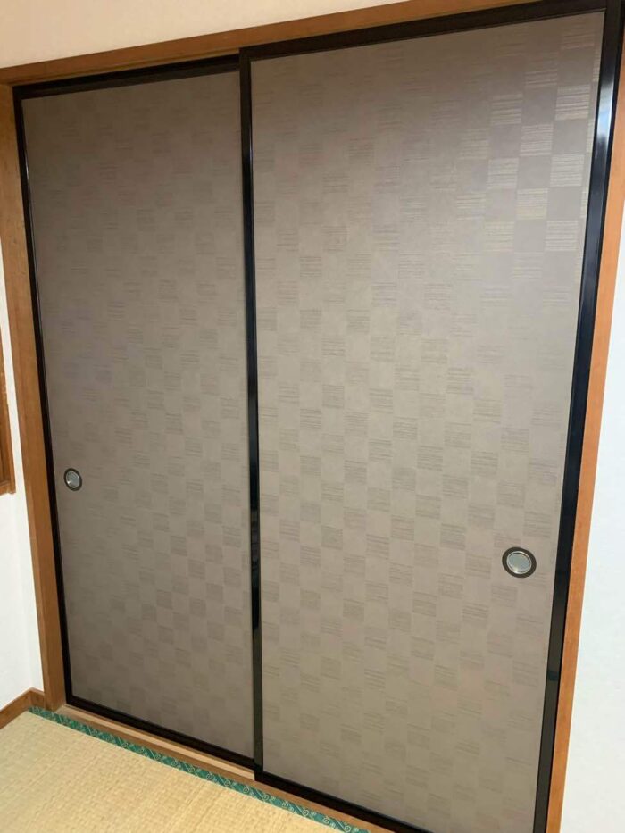 ふすまの柄について、実は現代風の柄も様々ございます。今回のお客様のふすまは、ブラウンとブロンズの市松模様の柄となっております。