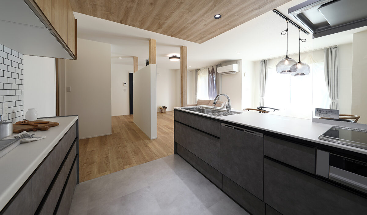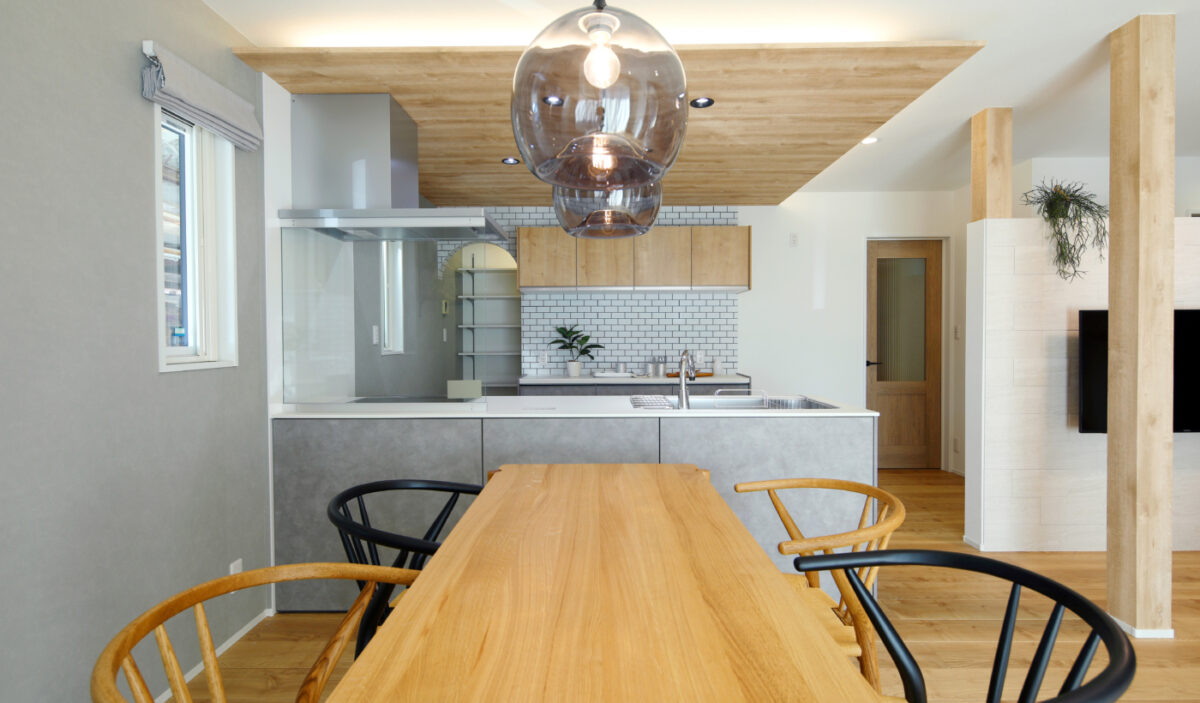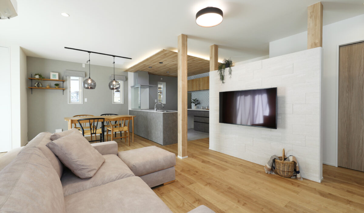 断熱性能を上げることを第一に、間取りの配置にこだわりました。バリアフリーを取り入れながらも、カフェのような雰囲気に仕上げています。床材の色合いや風合いもこだわり、温かみのある床材を採用することで空間全体に温かみをプラス。夜には間接照明によって昼間とは違った雰囲気を楽しんでいただけます。